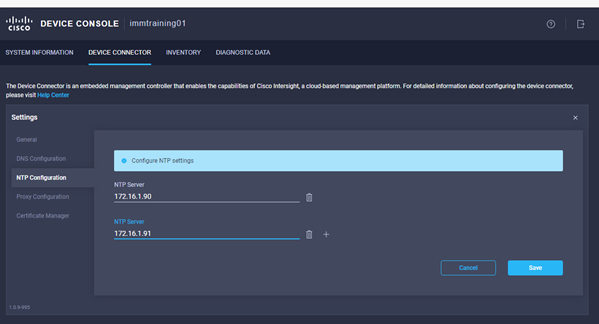 - Go to the NTP Configuration section and enter the NTP servers captured in the deployment worksheet, click save.