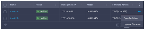 - As shown in the picture below, click the ellipsis (three dots) at the end of the row for either of the fabric interconnects and select Upgrade Firmware. Note: you should step through the wizard to see what the experience is like, but do not click Upgrade on the final step if the target FW version and current version are identical. You will waste a lot of time watching a firmware upgrade process that consumes a lot of time but doesn’t change anything.