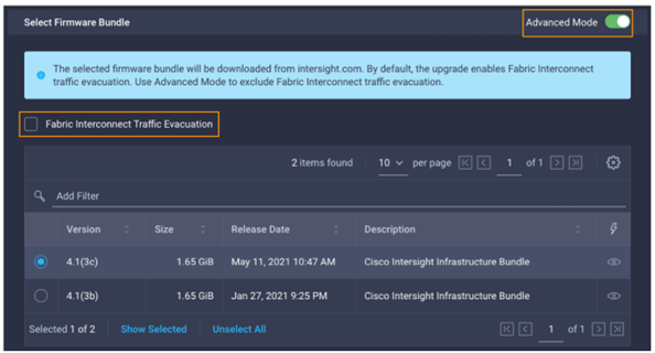 - Step two of the upgrade allows you to select a different version of firmware. New Fabric interconnects (or those with no discovered chassis) do not need to evacuate server traffic. You must select Advanced Mode and uncheck Fabric Interconnect Traffic Evacuation as shown below: