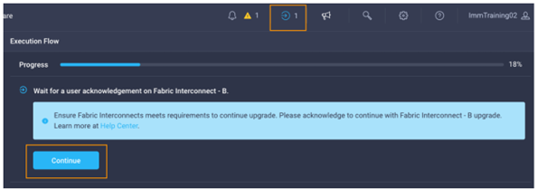 - It will take about 15-20 minutes for the first fabric interconnect to complete its upgrade. You will be required to confirm that it is okay to start upgrading the second fabric interconnect. Much like you did in the previous step, watch for the spinning blue circle to change to a circle with an arrow to indicate that your action is required. Click Continue and click Continue again on the popup.
