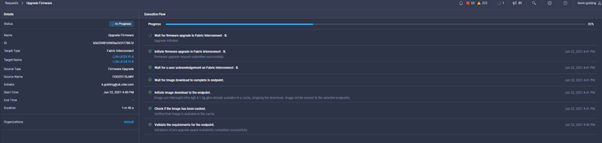 - It will take about 15-20 minutes for the second fabric interconnect to complete its upgrade. If you browse away from the firmware upgrade status, you can always get back to it by clicking on the spinning blue circle in the Intersight task bar to see current or completed tasks. Browse to OPERATE à Fabric Interconnects to confirm that both fabric interconnects are now running the correct version of firmware.