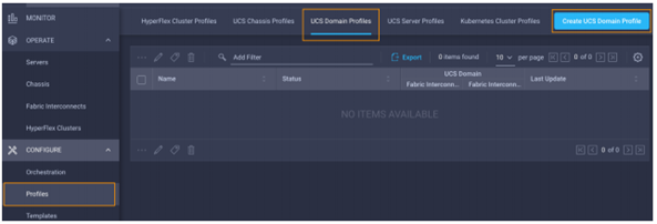 - While logged in to Intersight with the pre-requisite role, choose CONFIGURE à Profiles à UCS Domain Profiles à Create UCS Domain Profile, as shown below: