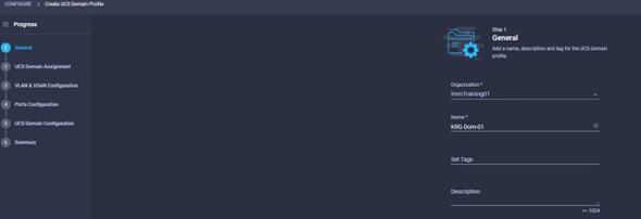 - Give the profile a meaningful name, some tags (if required) and a description. Once this first step is out of the way, you will then assign a physical domain, define the VLANs to be used, ports, and configuration settings for the domain. Click Next.