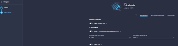 - Browse to Configure à Policies à UCS Domain à Network Connectivity and click Start to start the wizard, enter a meaningful name and provide tags and descriptions as required. Click Next