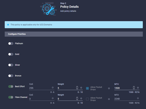- Browse to Configure à Policies à UCS Domain à System QoS and click Start to start the wizard, enter a meaningful name and provide tags and descriptions as required. Click Next