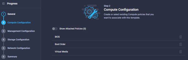 - See the sections ‘Policy Create: Virtual KVM’, ‘Policy Create: Local User’, ‘Policy Create: IMC Access’. Once selected, click Next to move to the ‘Storage Configuration’ section