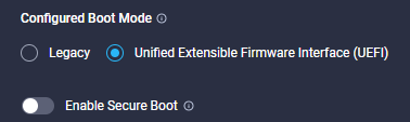 - Select the UEFI BIOS, most modern OS’s should support UEFI, toggle the Secure Boot button if needed: