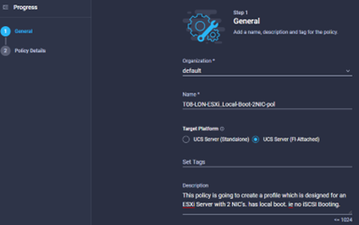 - Select UCS Server (FI-Attached), provide a name for the policy and select the organisation if this is NOT being used in the default Org. Provide tags and a description is necessary, descriptions are probably required more in this policy than any other due to the critical combination of network connectivity and OS requirements.