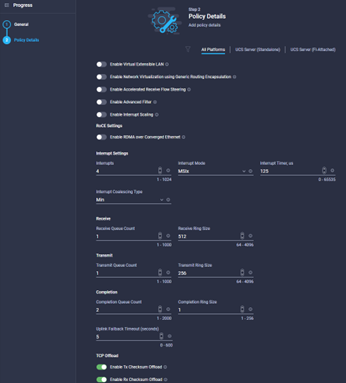 The rest of the LAN Connectivity policy is defining other policies which will be used to configure the vNIC, these are detailed in their relevant sections. Policies include: