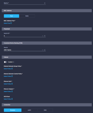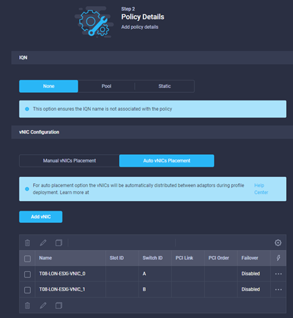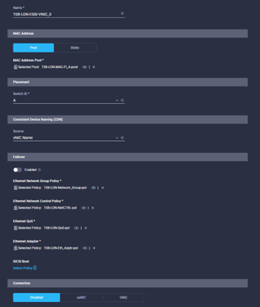 - Depending on the requirements of the OS, you may need this NIC to failover between FI’s or Switches. This LAN Connectivity policy is for ESXi, which handles NIC failure at the Host OS level, we will leave it disabled.