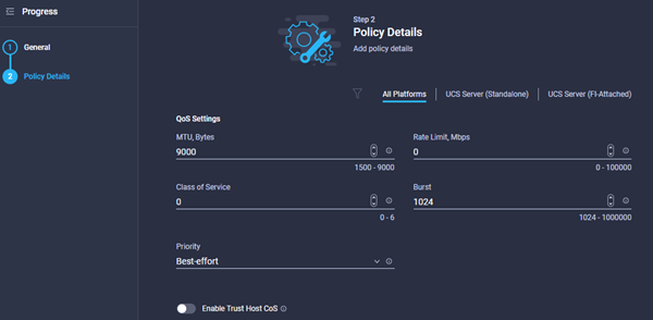QoS Policy includes MTU settings, Rate limits & Priorities etc.